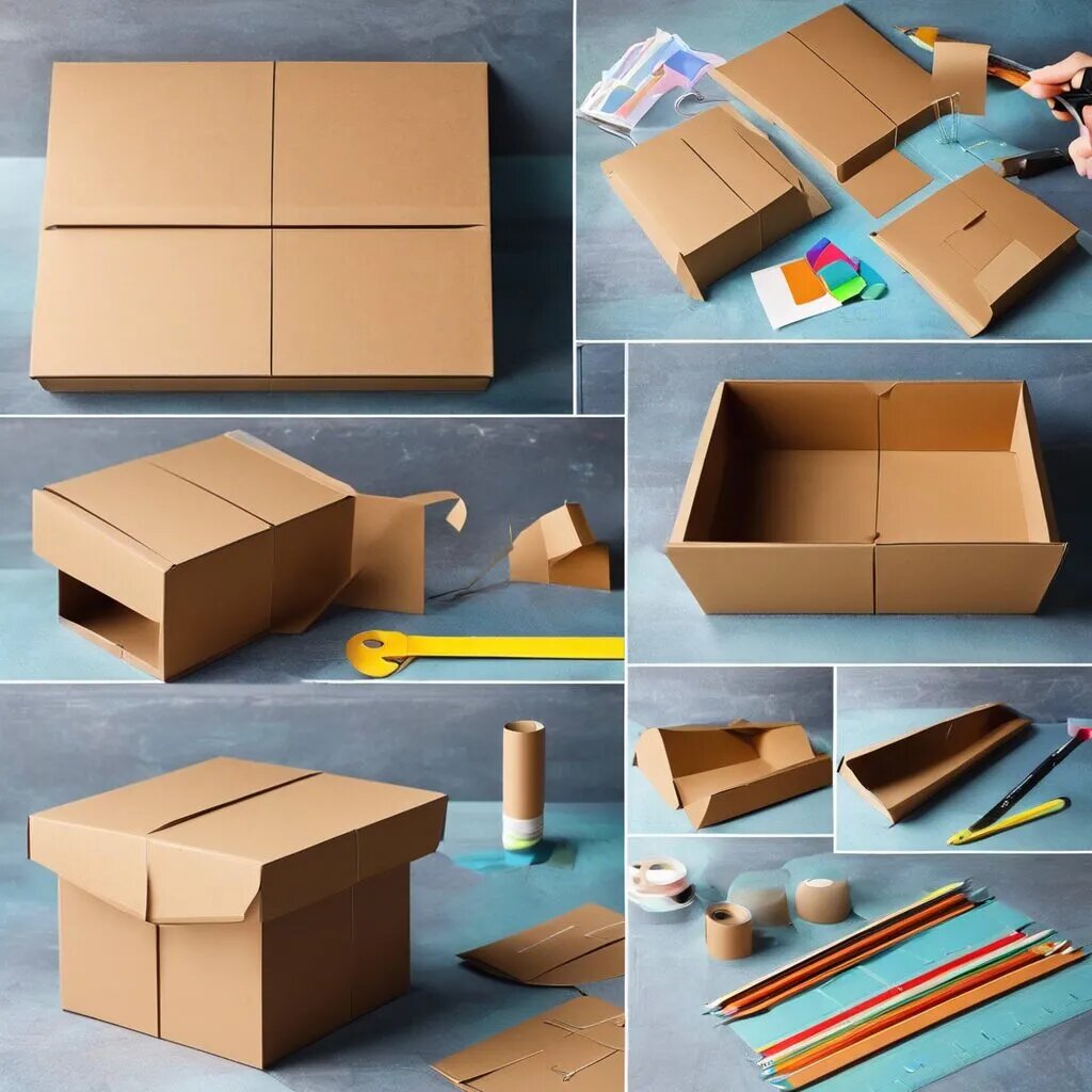 Материалы: 1. Картон или плотная бумага (цветная или с узором). 2. Ножницы. 3. Клей или двусторонний скотч. 4. Линейка. 5. Карандаш. 6. Украшения (ленты, наклейки, бусины и т.д.). ### Инструкция: 1. **Подготовьте материал**: Выберите картон нужного цвета или узора. Для маленьких подарков подойдет более тонкий картон, а для больших — плотный. 2. **Измерьте и нарисуйте шаблон**: - Определите размер коробки. Например, для коробки размером 10 см х 10 см х 10 см. - На картоне нарисуйте квадрат 10 см х 10 см. Это будет дно коробки. - От каждого края квадрата нарисуйте по 5 см – это будут стенки коробки. В итоге у вас получится фигура, напоминающая крест, с центральным квадратом (дно) и четырьмя стенками. 3. **Вырежьте шаблон**: Аккуратно вырежьте по нарисованным линиям. 4. **Сложите стенки**: Сгибайте стенки вверх, используя линейку для создания четких складок. 5. **Склейте стенки**: Нанесите клей или приклейте двусторонний скотч на края стенок и прижмите их друг к другу, чтобы они склеились