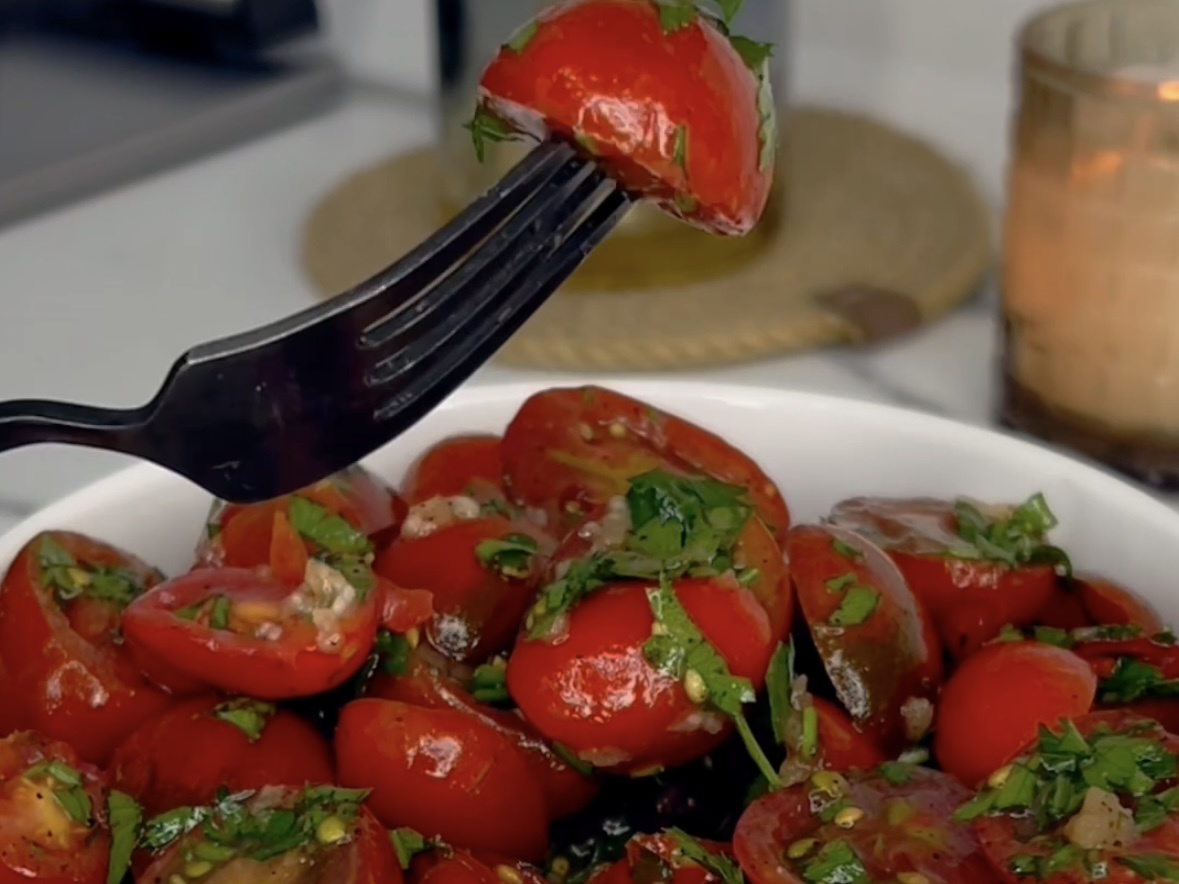 Помидоры черри разрезать пополам, добавить рубленную петрушку, чеснок через пресс, перец, соль, сахар, уксус и растительное масло. Перемешать и оставить хотя бы на час.