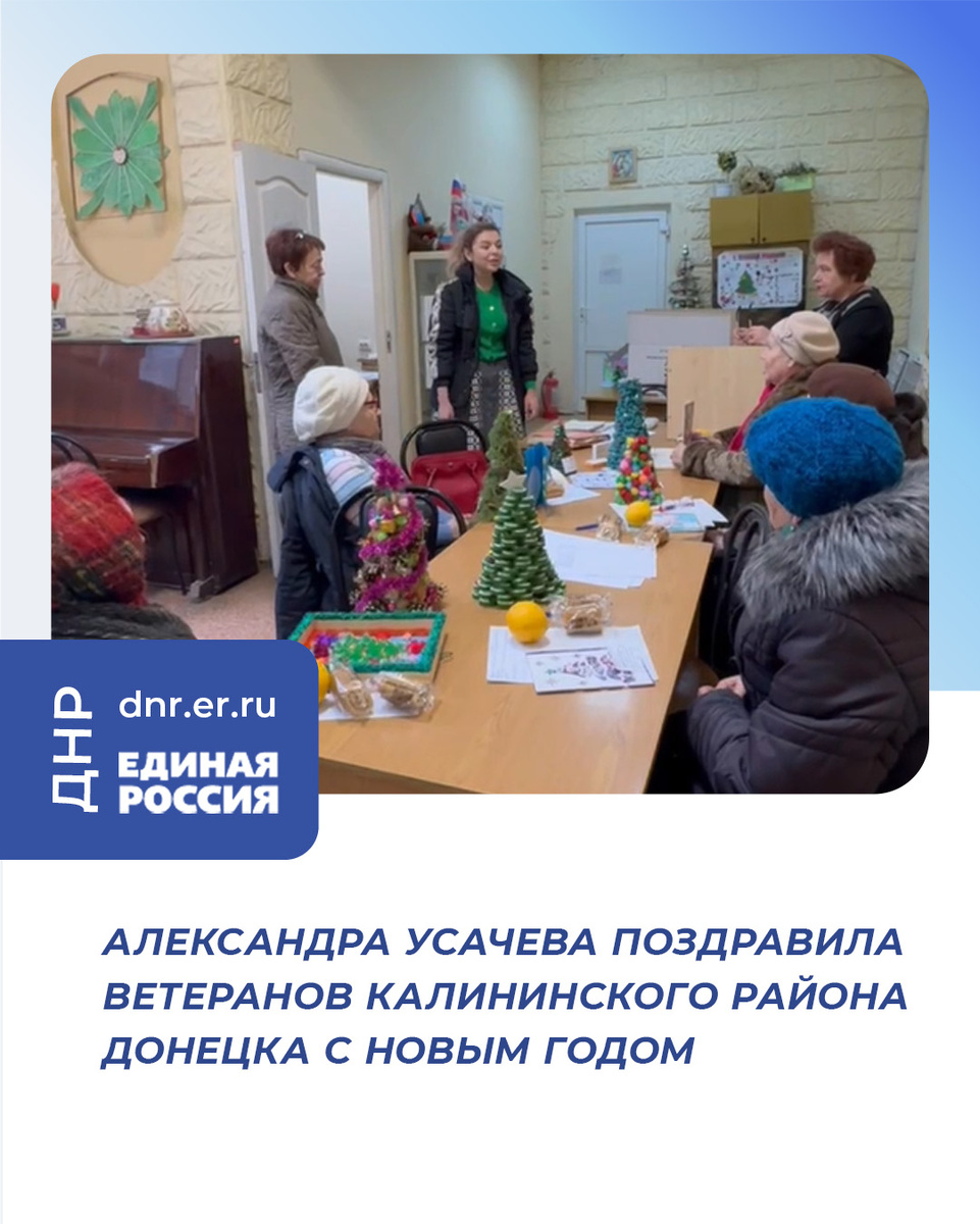 🎄 В поддержку всероссийской акции «С Новым годом, ветеран!» депутат НС ДНР Александра Усачева посетила Территориальный центр социального обслуживания Калининского района Донецка. ❄️ Ветеранов поздравили с наступающим Новым годом, вручив им фрукты, сладкое к чаю, а также памятные подарки в виде поздравительных открыток и самодельных ёлочек, созданных детьми. «Такие встречи вдохновляют и напоминают о важности уважения к старшему поколению. Ветераны делятся своими историями, своим опытом и мудростью, которые помогают нам лучше понять и уважать прошлое. Поздравление ветеранов перед Новым годом – это не просто традиция, это возможность выразить признательность за их подвиг и пожелать им радости, здоровья и благополучия», – отметила Александра Усачева. #ЕРДНР #СНовымГодомВетеран #МыВместе #ЕдинаяРоссия