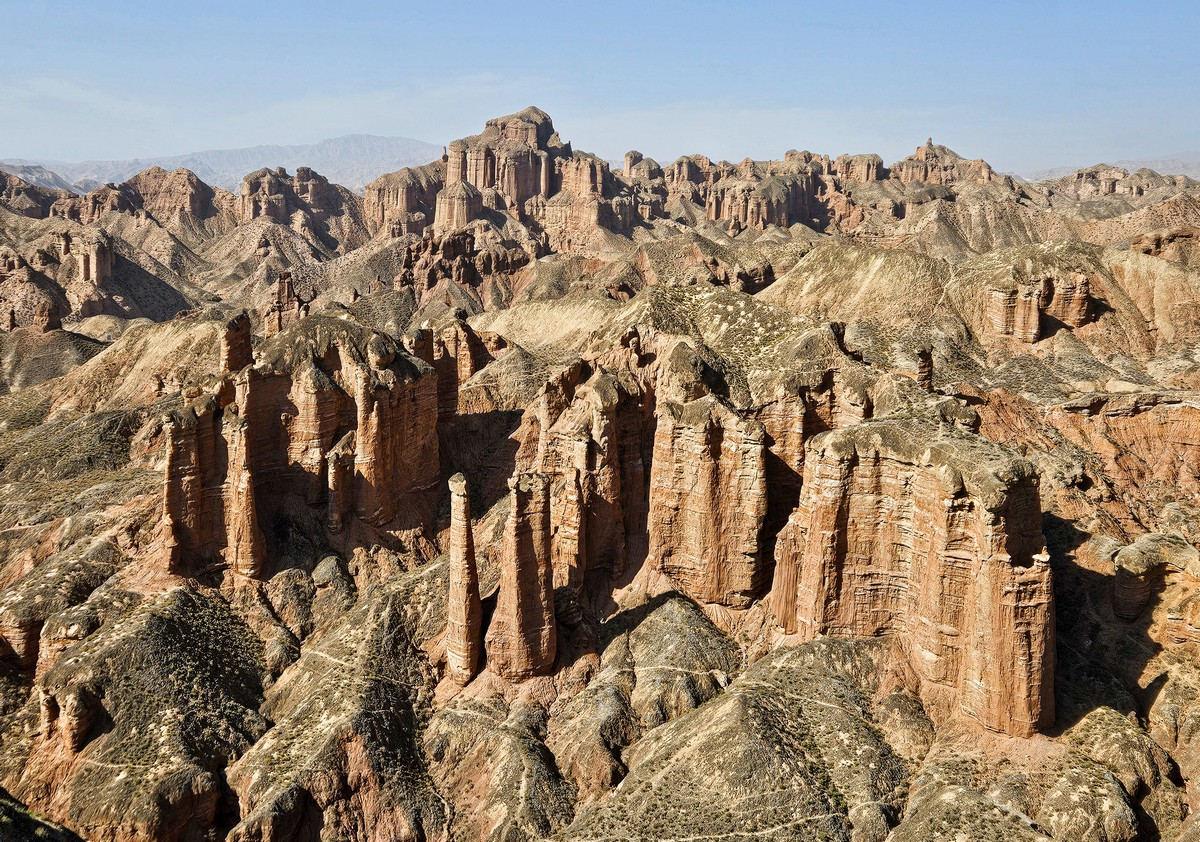 Ненадолго вернёмся в наше уже прошлогоднее осеннее путешествие по Китаю. Всё рано или поздно заканчивается, и наш маршрут не исключение. Завершающая точка туристической программы – геопарк Бингоу Данься (Binggou Danxia), расположенный в 12 км от разноцветных гор Чжанъе Данься. Виды здесь совершенно иные: на значительной территории находятся скальные конструкции самых разных видов и форм. Так и хочется похвалить местных геодизайнернов :) Посетителей – никого. Практически весь туристический поток оттягивают на себя более известные и ближе к городу расположенные цветные горы, посему турцентр и площадка перед ним выглядят вот таким образом: Здесь два маршрута, каждый примерно на два часа прогулок. Увы, у нас столько времени не было, и мы пошли по одному из них, как показалось, по более красочному. Начало прогулки – туристов кроме нас практически ноль: Идём, гуляем, по сторонам смотрим. А неплохо! На вершине одной из колонн – арка. Вот она покрупнее: Дальше роскошность видов только нарастае