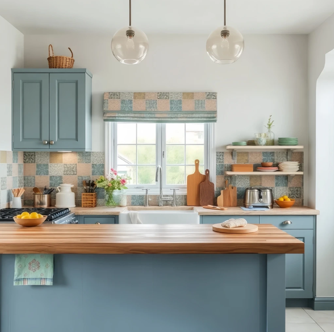 Кухня в стиле пэчворк — это гармония текстур и ярких красок. Основные черты включают: