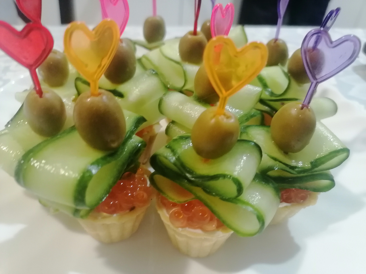 - Дополняем тарталетку шпажкой из огурца и оливки.