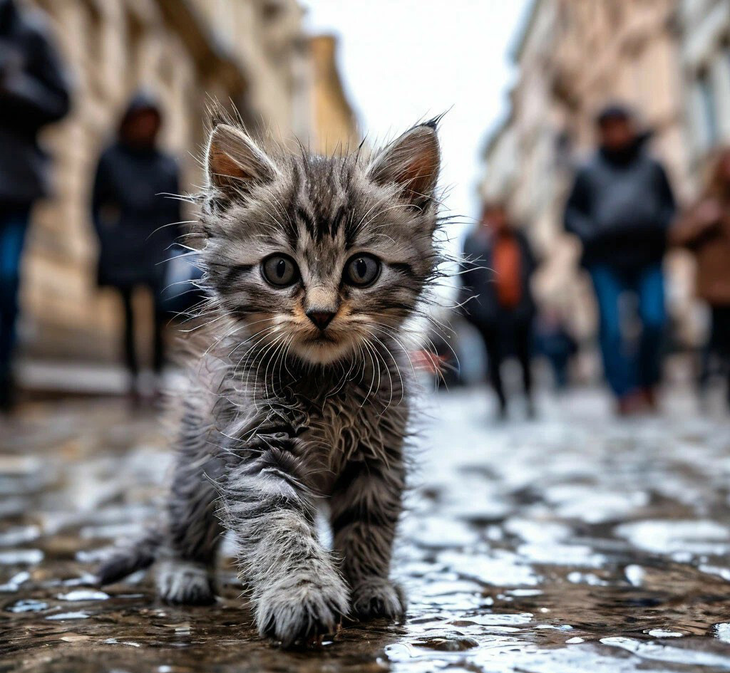 "Иди ко мне, кроха," - нежно проворковала женщина, опускаясь на колени перед убежищем малыша. Извлеченное на свет создание являло собой жалкое зрелище: промокший насквозь комочек жизни. Но для спасительницы это не имело значения - в её глазах светилась безграничная любовь.