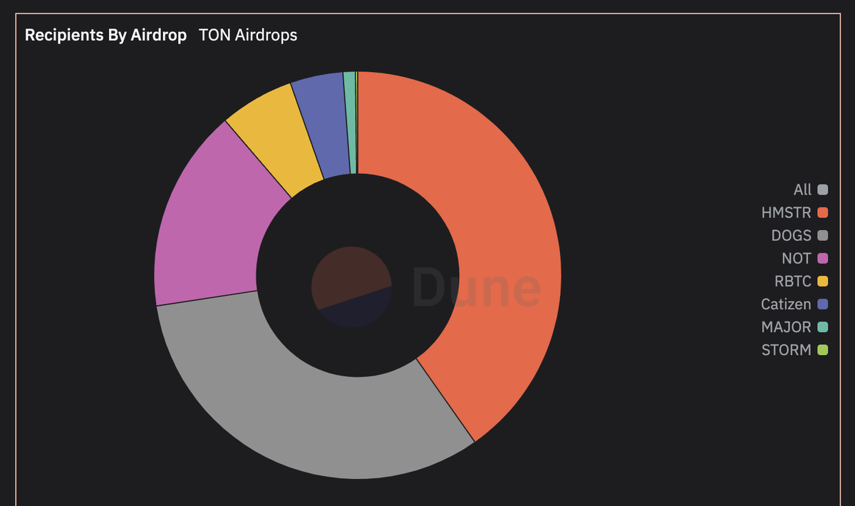 Эта статья — краткий обзор итогов самых популярных эйрдропов на блокчейне TON в 2024 году. [ Спойлер для тех, кто недавно узнал про крипту: эйрдроп — это бесплатные "денюшки", которые криптопроекты раздают своим пользователям]. Выше представлена круговая диаграмма с распределением количества пользователей, которые получили популярные эйрдропы в 2024. Очевидно, что самым популярным проектом в прошлом году был Hamster Kombat (токен HMSTR). Здесь интересно то, что из изначальной аудитории в 350 миллионов человек дроп забрали только 13 миллионов. Посчитали ли участники проекта ниже своего достоинства забирать те копейки, которые им достались? Возможно. Мне кажется, что результаты проекта и эйрдропа прекрасно иллюстрирует данное видео молодого блогера: Вторым по популярности получился проект Dogs (токен DOGS). И большинство участников, наверное, сойдутся во мнении о том, что это был самый крутой дроп именно потому, что "делать ничэво не надо было, а денюшки фсе равно дали". По количеству