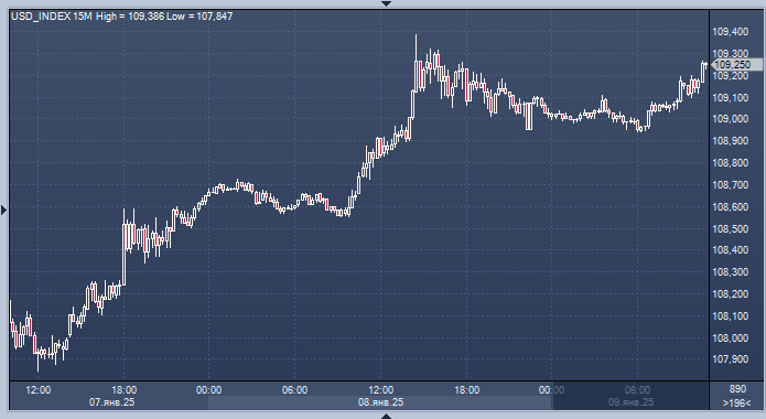 Повсеместный рост курса доллара держит фунт, евро и иену под давлением График индекса доллара интервалами в 15 минут В четверг доллар США продемонстрировал рост, чему способствовало увеличение доходности казначейских облигаций. Это оказало давление на иену, фунт стерлингов и евро, которые приблизились к многомесячным минимумам. В 2025 году внимание рынков будет приковано к политике избранного президента США Дональда Трампа, который вернётся в Белый дом 20 января. Аналитики ожидают, что его действия будут способствовать как росту экономики, так и усилению ценового давления. В среду CNN сообщил, что Трамп рассматривает возможность введения чрезвычайного положения в экономике страны, чтобы обеспечить правовое обоснование для введения универсальных тарифов для союзников и противников. В понедельник Washington Post сообщила, что Трамп рассматривает более мягкие тарифы, которые он позже опроверг. Угроза введения тарифов привела к росту доходности облигаций: в среду доходность эталонных 10-ле