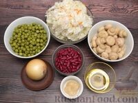 Интересное и необычное, но при этом удачное сочетание квашеной капусты с отварной фасолью, консервированным горошком, луком и маринованными грибами. Фасоль, грибы и нежный горошек хорошо уравновешивают вкус квашеной капусты и делают салат сытным. А заправка из горчицы с ароматным маслом придаёт ему пикантный вкус. Продукты Капуста белокочанная квашеная - 500 г Фасоль (в сухом виде) - 70 г Шампиньоны маринованные - 190 г Горошек зелёный консервированный - 150 г Лук репчатый - 80 г (1 некрупный) Горчица - 1 ч. ложка Масло растительное - 30 мл (2 ст. ложки) Подготавливаем необходимые продукты.