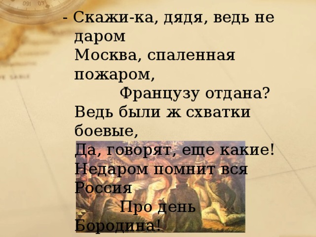 Вы когда-нибудь обращали внимание, что в знаменитом, знакомом каждому жителю России стихотворении Лермонтова «Бородино» встречаются слова «недаром» и «не даром» – в одном месте «не» слитно, а в другом раздельно?