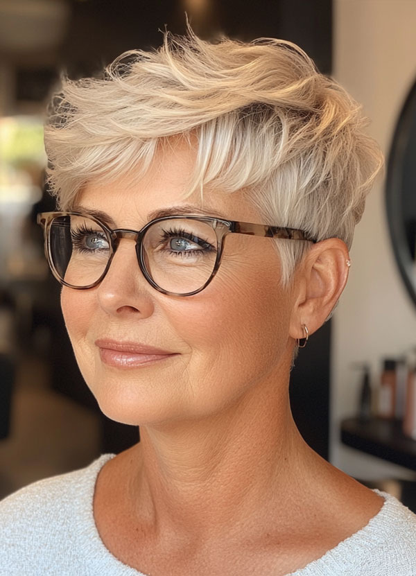 Элегантная стрижка пикси для блондина - изысканный и стильный вариант для женщин старше 60 лет. Мягкий блонд с едва заметными бликами добавляет глубину и естественное сияние, усиливая сияние кожи. Короткая, многослойная стрижка создает объем и движение, в то время как косая челка добавляет нотку современного стиля и красиво обрамляет лицо. В сочетании с классическими очками в черепаховой оправе этот образ подчеркивает глаза и скулы, предлагая шикарный и изысканный вид. Идеально подходит для тех, кто ищет не требующую особого ухода, но изысканную прическу, эта стрижка излучает уверенность и вечную элегантность