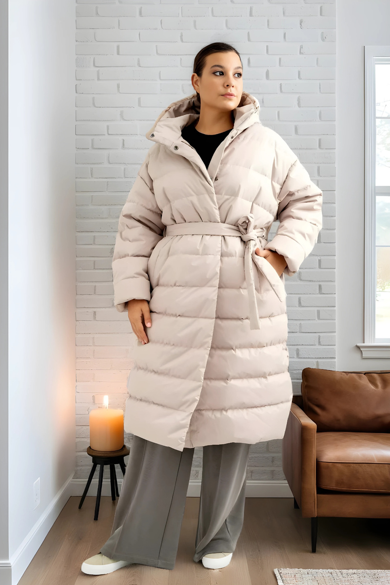 - Пальто с поясом на бедрах