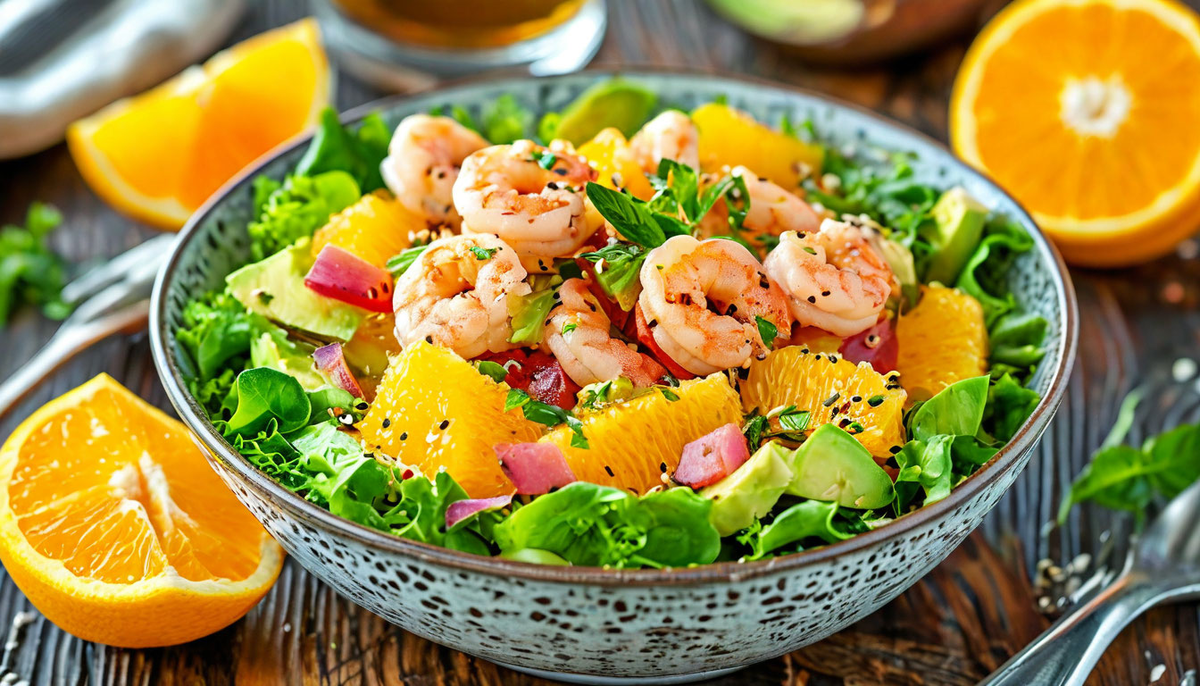 - Добавьте обжаренные или варёные креветки и посыпьте салат обжаренными грецкими орехами.