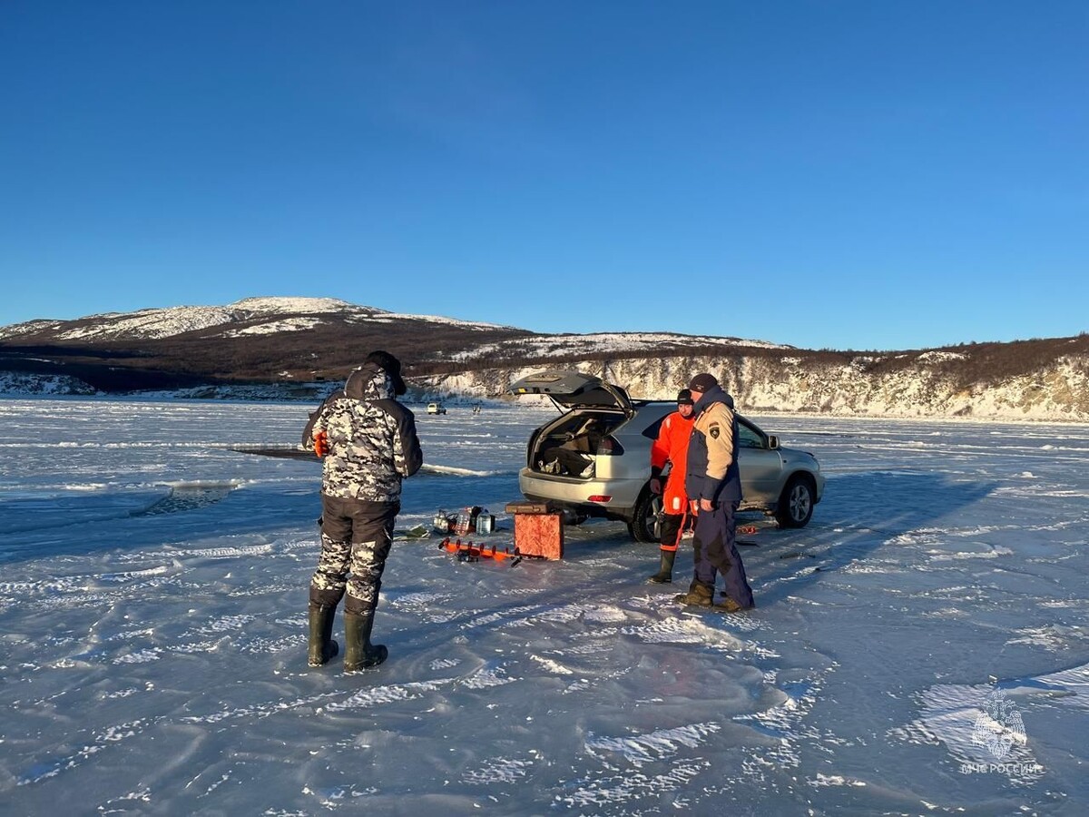 В бухте Гертнера - излюбленном месте магаданских любителей подледной рыбалки - произошел разлом ледового поля. Во время обследования акватории спасатели МЧС России обнаружили на отколовшейся льдине четырех человек на двух автомобилях. После долгих уговоров рыбаки согласились покинуть лед. Мужчин с помощью судна на воздушной подушке доставили к берегу, медицинская помощь им не потребовалась. Внимание! Ледовое поле в бухте Гертнера деформмровано и покрыто трещинами, выход и выезд на лед опасен!