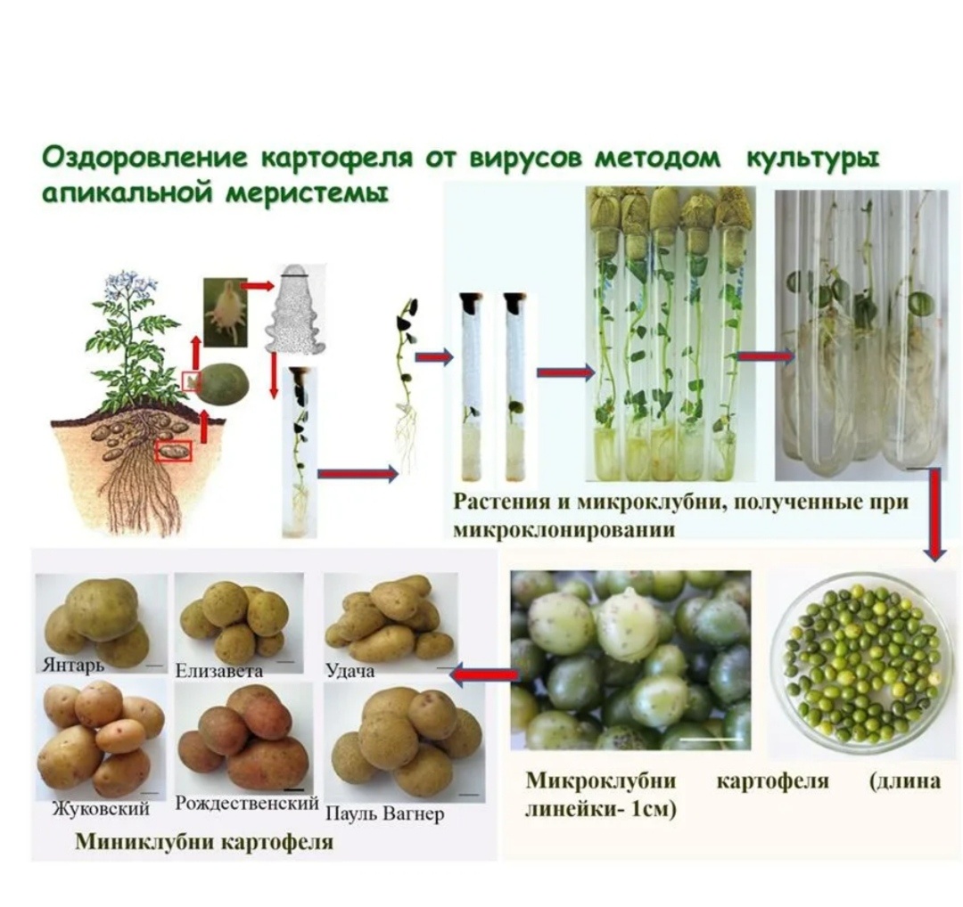 Картофель для нас-это второй хлеб! И если грибные заболевания поддаются лечению, то вирусные нет. В итоге падает и урожайность, и качество,и вкус картофеля.Но к счастью, найден способ выращивания здоровых, не пораженных вирусом клубней! Одним из способов выращивания элитного картофеля является метод выращивания растений из апикальных ( верхушечных ) меристем.Такой картофель выращивают научные учреждения или специализированные учреждения. Цель такого выращивания растений в пробирке- получить безвирусный семенной материал( клубни).И именно клубни! Ботаническими семенами картофель не размножают. Да и вирусы передаются семенами.Элита картофеля на безвирусной основе превышает по урожайности элиту, выращенную только на основе визуального отбора, в среднем на 30%.