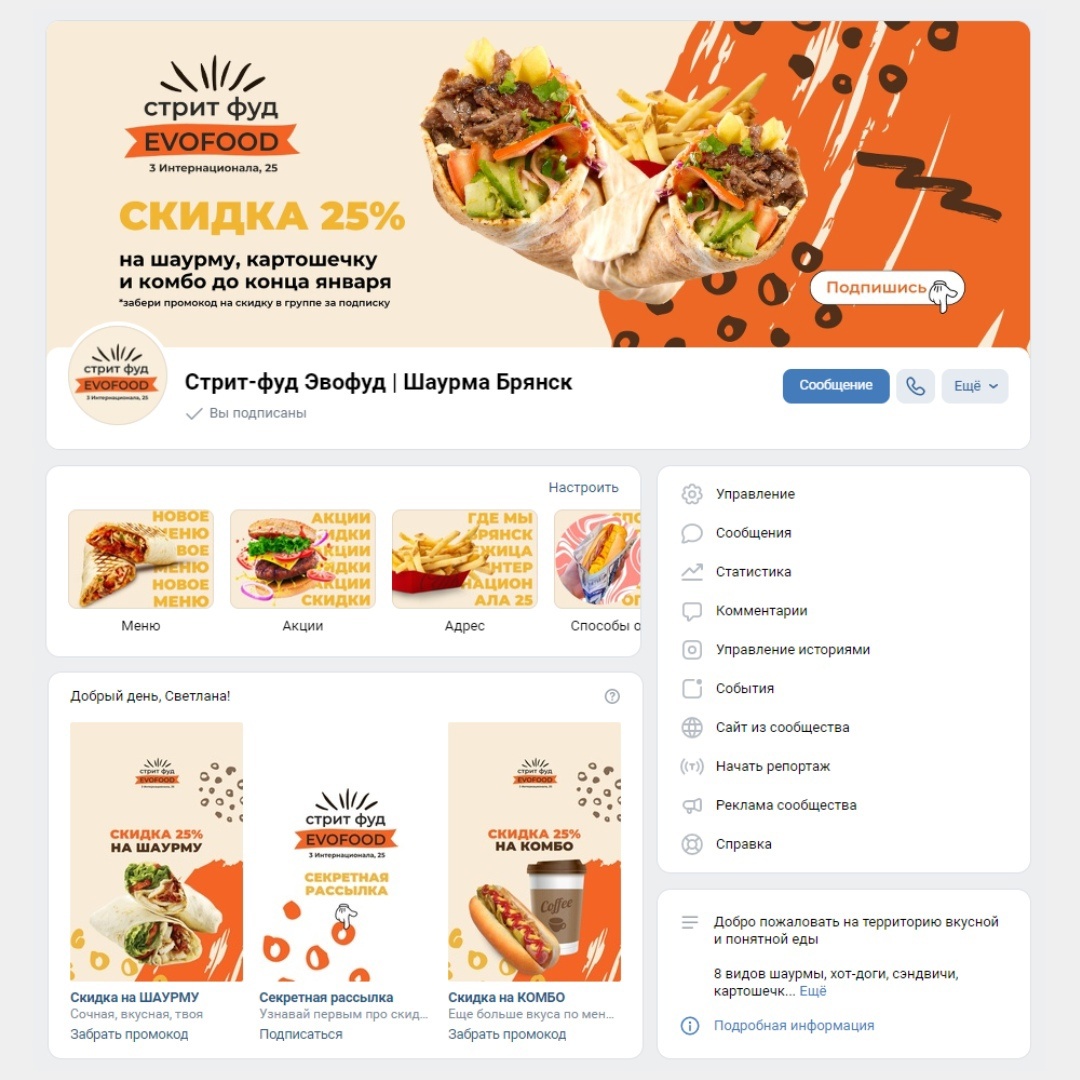 Дизайн сообщества ВК для стрит-фуда EVOFOOD (оформление «под ключ»)