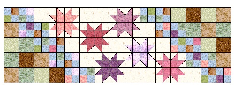 Хочу поделиться с вами процессом шитья дорожки на стол, которую я сшила буквально за один день. Идею подсмотрела на Pinterest. Цветовую гамму выбрала исходя из обстановки комнаты, которую эта дорожка будет украшать, по моей задумке. Итак, вот эскиз изделия. Как вы видите, дорожка состоит из квадратов и шести блоков "Пилообразная звезда". Я решила, что блоки будут размером 6" (15см), большие квадраты - 3" (7,5см), маленькие - 1.1/2" (3,75см) - размеры в готовом изделии. При таких размерах целое изделие получается примерно 37х110см. Размеры в сантиметрах, приведённые в статье, предполагают припуски 0,75см. Для дюймов - стандартные 1/4". Начнём шить со звёздных блоков. В моём изделии они сшиты из двух видов ткани: цветной и фоновой. Для каждого блока мне нужно выкроить: Из цветной ткани : один квадрат 3.1/2" (9см), четыре квадрата 2.1/2" (6,75см). Из фоновой ткани: один квадрат 4.1/4" (11,5см) и четыре квадрата 2" (5,25см) На изнанке маленьких цветных квадратиков размечаем диагональ. Клад