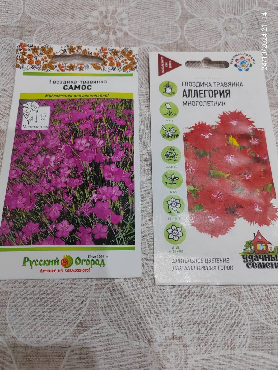 Гвоздику-травянку я ни разу не садила, но подозреваю, что она очень похожа на гвоздику от Помидома, в этом году посадим и посмотрим что за красота вырастет, и, главное, будет ли она в условиях севера многолетней. На всякий случай придется сразу определять ее на подходящее место посредине грядки, чтоб не вымерзла, и росла не один год (вдруг переживет нашу зиму). Приобрела я семена двух сортов: Самос и Аллегория. Гвоздика-травянка Самос. Сорт с очень яркой, насыщенной окраской лепестков. Цветочки одиночные, насыщенно-розового цвета. Период цветения длится с июня до конца августа. На протяжении всего лета от растения исходит приятный аромат. Растение может использоваться как горшечная культура. Сеют семена гвоздики в марте апреле. На постоянное место рассаду высаживают в мае июне, выдерживая расстояние между растениями 10-15 см. Гвоздика-травянка Аллегория. Многолетнее неприхотливое травянистое растение высотой до 20 см с узловатыми стеблями, часто ветвящимися в верхней части. Обычно все