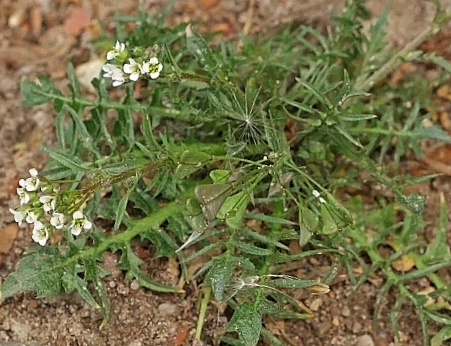 Это сердечник извилистый. Растение очень узнаваемо, имеет сильнорассеченные листья, собранные в розетки. А из середины поднимается цветонос с белыми цветочками.