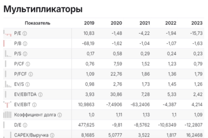 Публичное акционерное общество «Аэрофлот» — российские авиалинии» в последние годы переживает значительные изменения в своих финансовых показателях. Рассмотрим ключевые мультипликаторы и коэффициенты с 2019 по 2023 год, чтобы оценить текущее состояние компании и ее перспективы. Начнем с показателя P/E (Price-to-Earnings), который в 2019 году составлял 10,83, что указывает на разумную оценку прибыли компании. Однако в последующие годы этот показатель значительно ухудшился: в 2020 году он стал отрицательным и составил –1,48, в 2021 году — –4,22, в 2022 году — –1,94, а в 2023 году упал до –15,73. Отрицательные значения P/E свидетельствуют о том, что компания не только не генерирует прибыль, но и продолжает сталкиваться с убытками, что настораживает инвесторов. Анализ показателя P/B (Price-to-Book) также показывает негативные тенденции. В 2019 году он был на уровне –68,19, что является аномально низким значением. В 2020–2021 годах показатель оставался отрицательным, но немного улучшился: