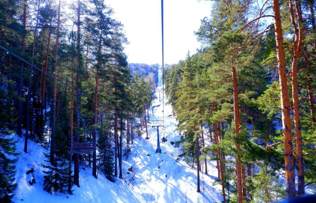 "Длина маршрута от его начальной точки до вершины горы Церковка - 2050 м. Канатная дорога поднимает гостей Алтая на высоту 801 м над уровнем моря. Отсюда открывается головокружительное зрелище! Кажется, что небо совсем близко, и можно дотронуться до облаков, внизу видны бескрайние поля и алтайское предгорье. Иногда летом есть шанс увидеть радугу. Зимой путешественники могут любоваться вершинами гор. С такой высоты дома Белокурихи кажутся совсем маленькими. По легенде люди, достигающие горного пика, могут загадать желание."