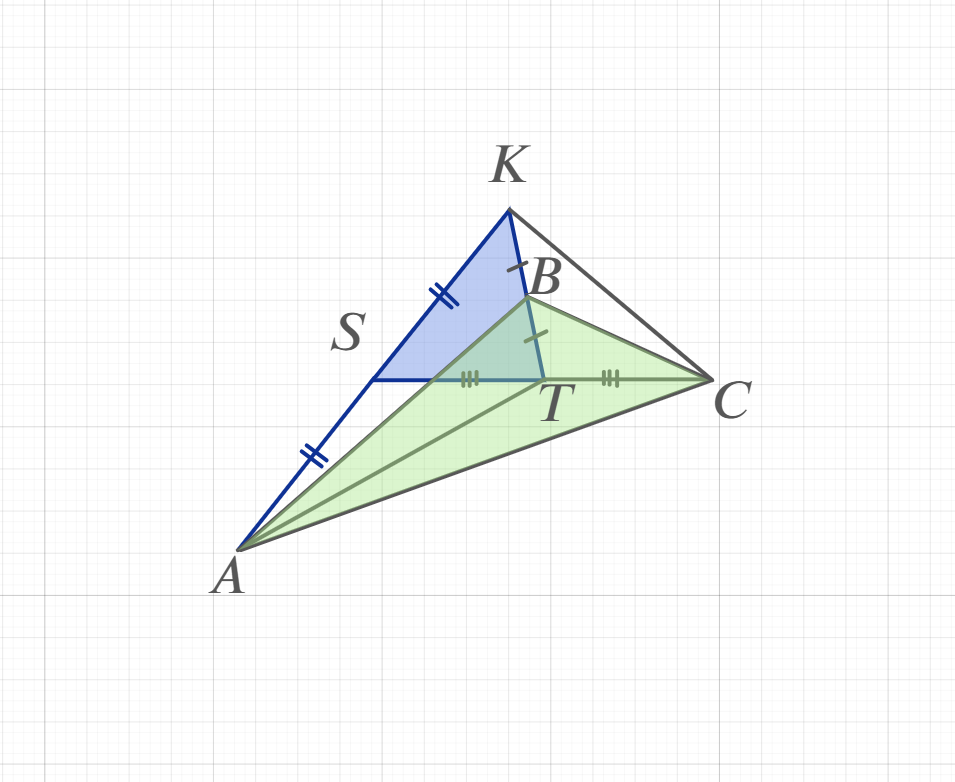 34. ★★☆Площадь голубого треугольника равна 1. Его стороны продолжили так, как показано на рис. Найдите площадь треугольника ABC.