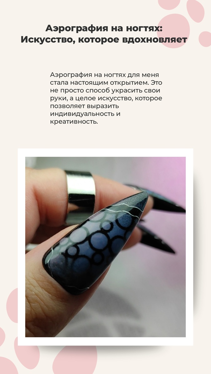 Aэрография на ногтях – это современное направление в нейл-арте, которое сочетает в себе живопись и маникюр. Этот метод позволяет создавать уникальные и сложные дизайны, которые сложно реализовать другими способами. Благодаря аэрограду можно добиться плавных переходов цветов, точечных рисунков и объемных эффектов. С каждым годом аэрография на ногтях приобретает всё большую популярность. Известные мастера нейл-арта создают настоящие шедевры, которые завораживают своим дизайном и детализацией. Тенденции моды меняются, но возможность выразить свою индивидуальность с помощью рисунков на ногтях всегда была важной частью имиджа. Процесс аэрографии включает несколько этапов: Аэрография на ногтях – это удивительное искусство, которое позволяет вам выразить свою индивидуальность и выделиться среди остальных. Если вы хотите попробовать что-то новое и яркое, не упустите возможность обратиться к мастеру аэрографии – вы не пожалеете