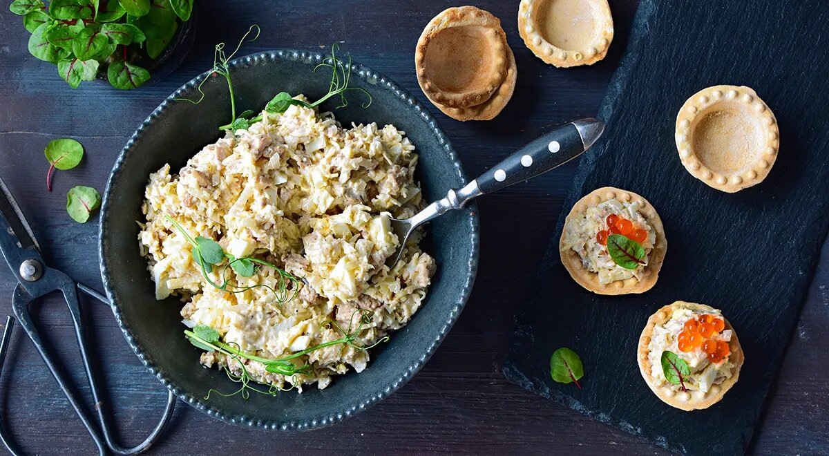 Классический салат из печени трески - универсальное блюдо, которое подойдет как для праздничного застолья, так и для уютного ужина без особого повода. Все необходимые ингредиенты обычно найдутся на кухне или легко приобретутся в ближайшем магазине. Соберите необходимые продукты для приготовления классического салата из печени трески. Отправьте яйца в кастрюлю, залейте водой и доведите до кипения. Варите их не дольше 10 минут. После варки слейте горячую воду и поместите яйца под струю холодной воды. Оставьте на 10 минут — так скорлупа легче снимется. Очистите луковицу и мелко порежьте. Пересыпьте нарезанный лук в миску, добавьте немного столового или винного уксуса, перемешайте и оставьте мариноваться на 10 минут. Натрите твердый сыр на терке с мелкими или средними отверстиями. Консервированную печень трески переложите из банки в сито, чтобы стекла лишняя жидкость. Затем выложите ее в миску и разомните вилкой. Очистите яйца, нарежьте их мелкими кубиками и добавьте к печени трески. Соеди