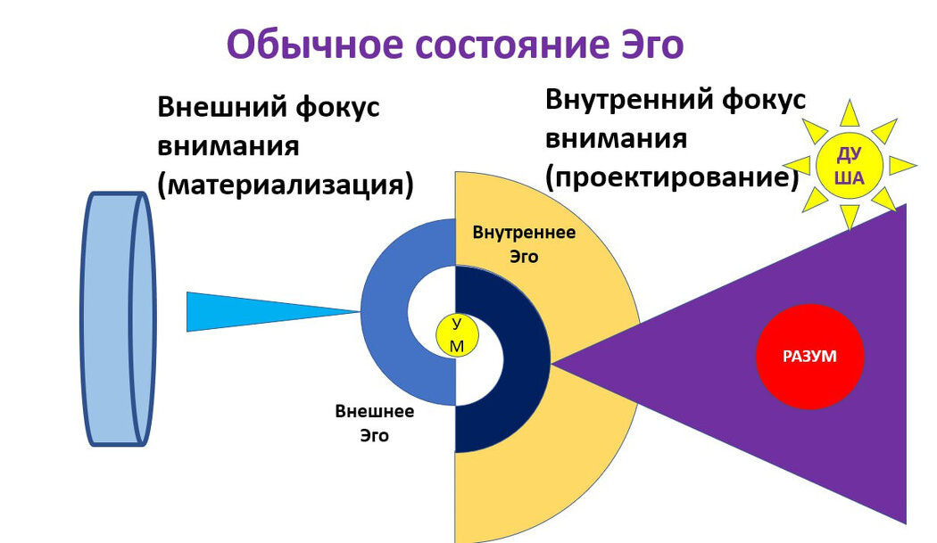 На рисунке изображена "обычная" схема работы психического аппарата личности, когда Ум (интеллект) создаёт фазовый сдвиг между внутренним и внешним Эго за счёт доминирования, например, материалистических идей.