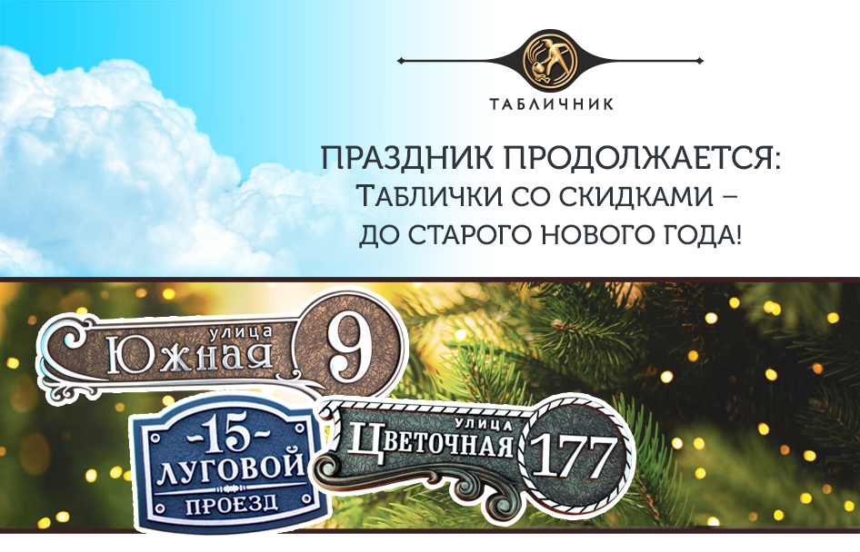 Источник фонового фото на баннере: GettyImages Поздравляем вас со светлым праздником Рождества! Надеемся, что каникулы проходят именно так, как вам хотелось: в окружении близких, с позитивным настроем и новыми вдохновляющими планами. Ну а если вам нужно больше поводов для радости – знайте, что акции «Табличника» не закончатся вместе с каникулами! Все праздничные скидки на гербы и адресные таблички из металла действуют до старого Нового года, то есть до 13 января включительно. А значит, у вас ещё есть шанс обновить и украсить свой дом по супервыгодной цене! Распродажа, не побоимся этого слова, грандиозная: Тёплое ретро, холодный хай-тек, строгая готика, причудливый модерн и вечная классика – это далеко не все стили, которые участвуют в акции! Стильное литое изделие от «Табличника» – это способ преобразить свой фасад, забор или входную группу без масштабной реновации. Такой акцент – на первый взгляд небольшой, но тщательно подобранный, – подчеркнёт вашу индивидуальность и выделит дом на