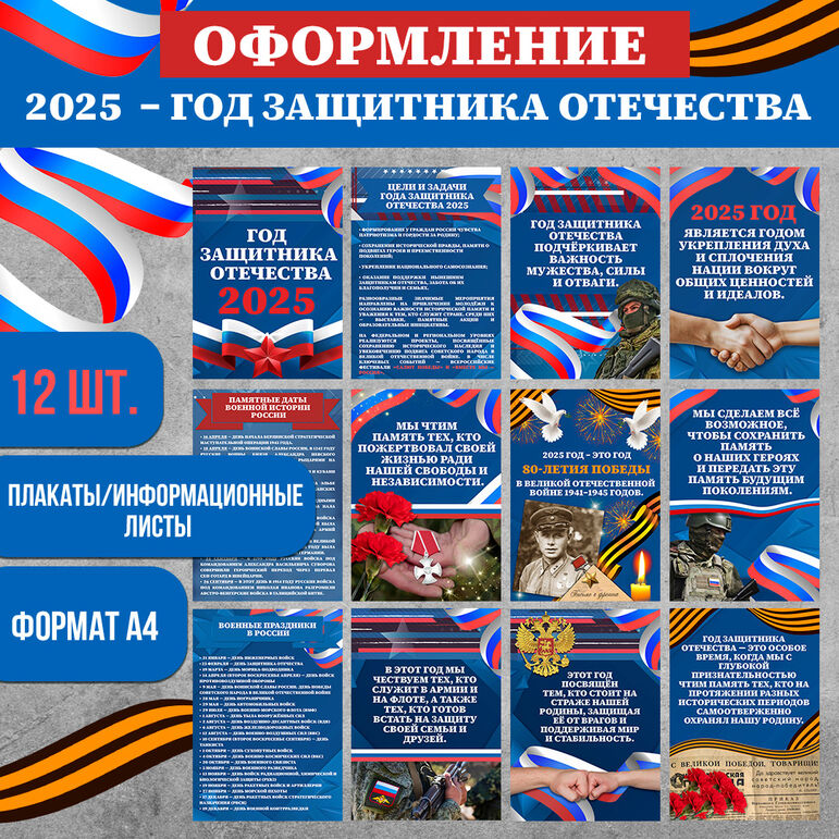 Данное оформление к Году защитника Отечества 2025 включает 12 плакатов/информационных листов формата А4. В комплекте: Данный материал разработан для оформления доски или информационного стенда в библиотеке, школе, ДОУ и т.д. Комплект представлен в PDF-формате. Президент Российской Федерации Владимир Путин провозгласил 2025 год Годом защитника Отечества. Это решение призвано почтить участников специальной военной операции, а также увековечить память о подвигах всех поколений, которые на протяжении истории самоотверженно защищали Родину. Год защитника Отечества — это не только дань уважения прошлому, но и напоминание о важности патриотического воспитания молодёжи. Мы чтим память героев, укрепляем связь поколений и вдохновляемся их примером. Этот год является символом единства, гордости за нашу страну и благодарности тем, кто защищает её сегодня. --------------------------------- А вот здесь можно скачать комплект речевых облачков ко Дню Победы (9 мая).