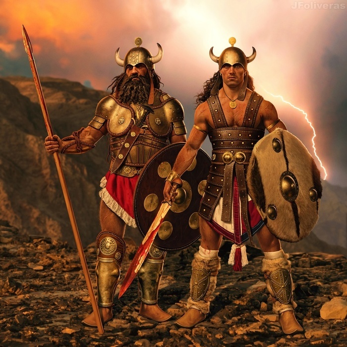 Кожаные доспехи воина справа, основанные на египетских изображениях, а также шипованный щит слева, примерно вдохновлены реконструкциями из Нурагической литейной мастерской. Мечи Науэ II и позднемикенские мечи, а также копье являются копиями археологических находок Орджана Энгедала (Серия «Воины бронзового века»).