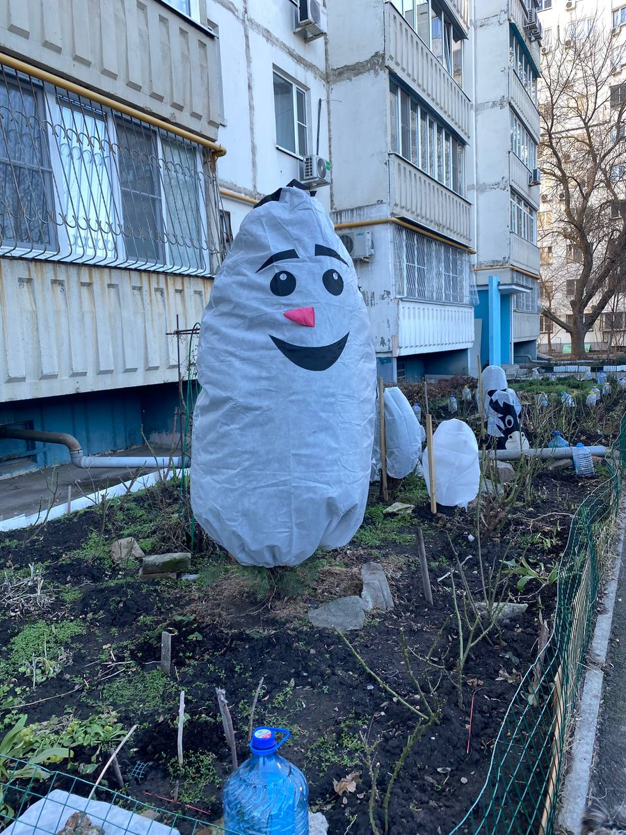 Этот оригинальный снеговик является укрывным материалом для растений. Он выполняет сразу две функции: защищает растения от морозов и обледенения, а также поднимает настроение всем прохожим. Его вид вызывает улыбку и напоминает о том, что зима все же пришла, пусть и без привычного снега.