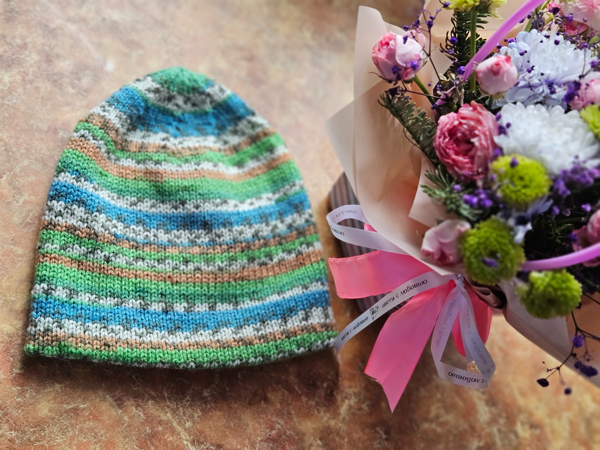Вот и вторая шапочка готова. Полная копия первой шапочки, только цвет другой. Цвет, конечно, интересный. Но, на каждую шапочку найдётся своя голова.