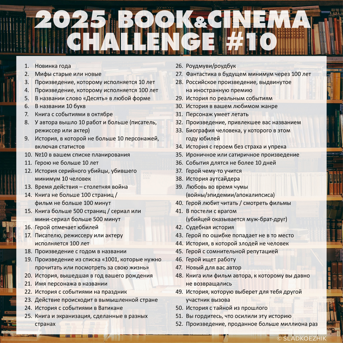 Книжные челленджи в Живом журнале - традиция, которой я следую вот уже седьмой год. Для тех, кто стоял у истоков, нынешнее книжное приключение - юбилейное. Правила участия не строгие. Количество выбранных из списка книг - произвольное. До сих пор справлялась со всеми пунктами. Нынешний год, думаю, не станет исключением. Предварительный список уже готов. Его вполне можно считать анонсом тех отзывов , которые постепенно появятся на канале на протяжении наступившего года. 1. Новинка года - Ольга Пашнина - Душа из света и дождя 2. Мифы старые или новые - Татьяна Муравьева - Мифы Поволжья. От Волчьего владыки и Мирового древа до культа змей и птицы счастья 3. Произведение, которому исполняется 10 лет - Эли Фрей - Мой лучший враг 4. Произведение, которому исполняется 100 лет - Сомерсет Моэм - Узорный покров 5. В названии слово «Десять» в любой форме – Арно Делаланд - Десять басен смерти 6. В названии 10 букв – Андреева Н. - Муж за алиби 7. Книга с событиями в октябре - Роджер Желязны - Н