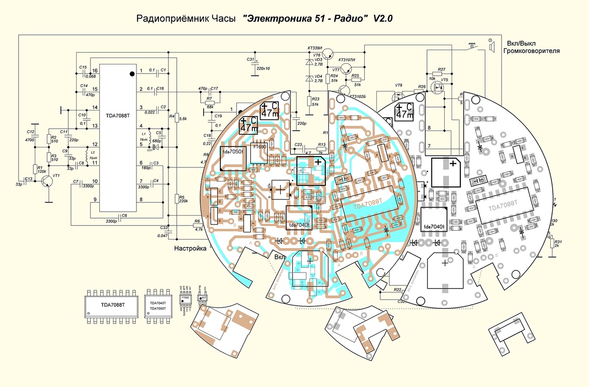 Как видно на схеме, версия разработки V2.2. Это говорит о том, что были собраны другие версии приёмников, с разными вариациями полной схемы. Есть даже версия V2.3 где отличие от данной заключается в усилителе наушников, там применяется TDA2822, в остальном изменений нет. Забегу в перёд. Буду тестировать схему на цифровой микросхеме по типу Si4825 и аналоговый с высокой ПЧ TA2003F, CD2003GP (sop16 корпус)