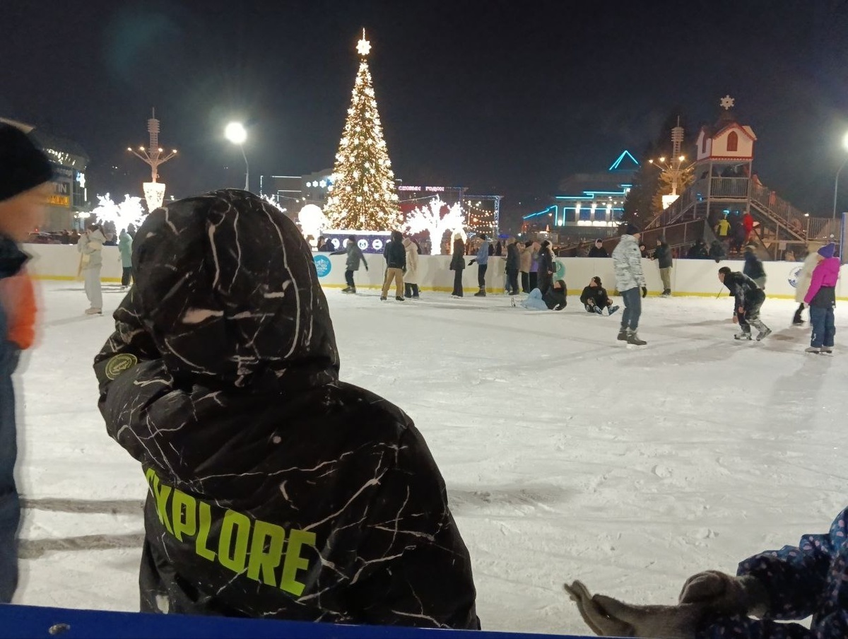 Для любителей активного отдыха на площади есть каток, где можно весело провести время на коньках. У нас катается дочка, есть свои коньки. Сын катается редко, ему брали напрокат, один раз не надел термо штаны под теплые брюки и краем конька натер хорошую такую мозоль. Но не страшно, уже зажила.