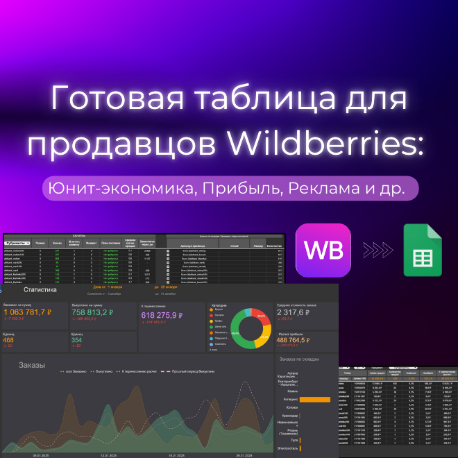 Наша таблица интегрируется с Wildberries через API и автоматически обновляет данные по следующим направлениям: 1.Подсчет чистой прибыли: 2.Анализ юнит-экономики: 3.Рекламная статистика: 4.Данные о продажах: 5.Уведомления в Telegram: