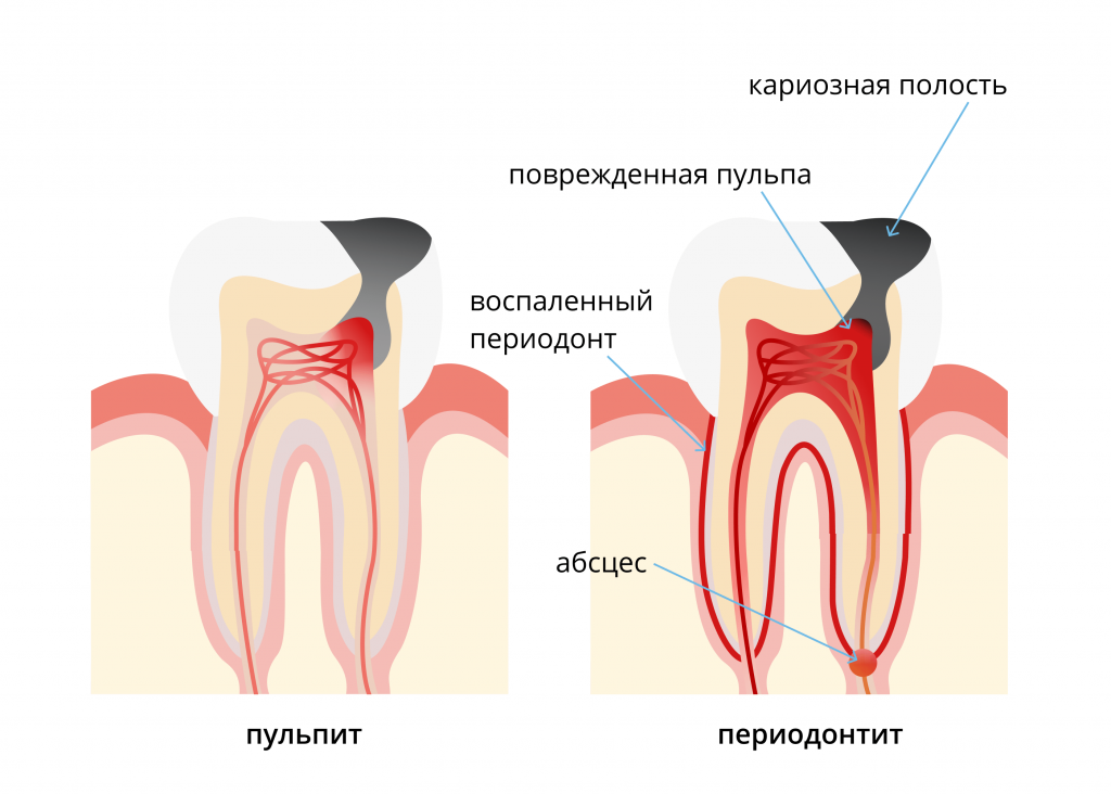 Пульпит и периодонтит. Два знакомых и так похожих друг на друга слова, которые слышал наверно каждый кто посещал стоматолога. Но действительно они так похожи друг на друга или нет. Давайте разберемся в чем же они отличаются друг от друга и что они из себя представляют Воспаление. Пульпит представляет из себя воспаление нерва и сосуда, а не связки и десны, как при периодонтите. Изменение цвета. При пульпите изменяется цвет зуба, а при периодонтите изменяет цвет десна. Подвижность. При пульпите нет подвижности, а при периодонтите оно есть. Боль. При пульпите резкая боль, боль также может перейти и в ухо и челюсть. Обычно, как и все зубные боли проявляется вечернее и ночное время, но также боль будет появляется от горячего и холодного. При периодонтите все не так просто. Ткань окружающая корень может быть воспален, а человек об этом может не знать, так как процессы длительное время будут протекать безболезненно. Но как его распознать? Изначально будет менять цвет десны на синий, а при пос