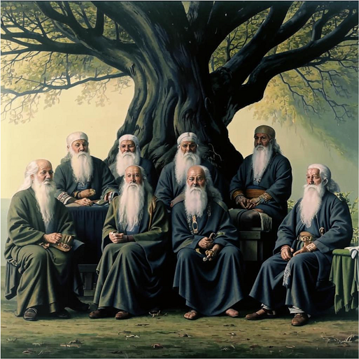 Старцы же сидели под большим дубом за накрытым столом. Их было человек пятнадцать-двадцать, они о чем-то рассуждали.