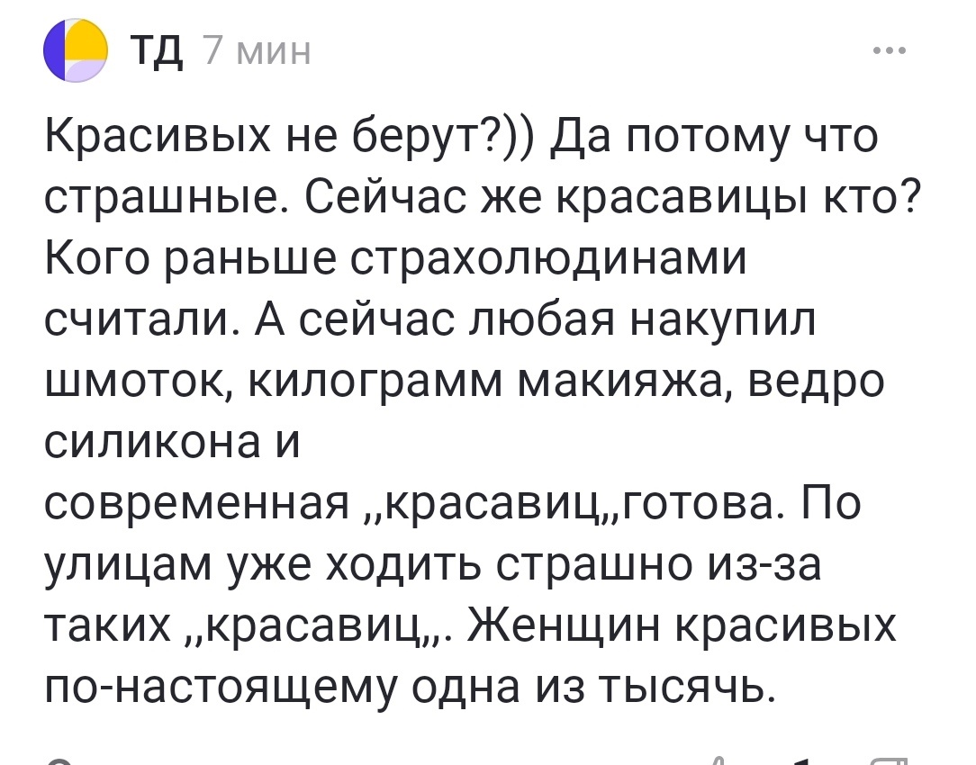 Кто Дзен читал, тот в цирке не смеётся. Особенно, если почитать мужские комментарии, рассуждения и – не побоюсь этого слова – философствования. Почему мужские? Потому что – без обид, мальчики! – именно тут можно наблюдать ярко выраженную «специфичность». Нет, среди комментирующих дам тоже попадаются всякие-разные оригиналки и даже уникумы, но их доля не столь высока, как в случае с комментариями дзеновских джентльменов (почти 100%). Вот взять хотя бы вечно актуальную тему женской красоты. Красоты и счастья в личной жизни. Веками народная мудрость внушала: «не родись красивой, а родись счастливой». Что, в принципе, не так уж далеко от истины. Но этот тезис многие почему-то понимают искажённо: «родилась красивой – будешь несчастливой». Не отсюда ли появилось заблуждение, что множество (вот прям чуть ли не большинство!) красивых женщин несчастны в личной жизни, одиноки и никому не нужны? А как вам такая "оригинальная" версия, почему красивых не берут замуж (брррр... как меня бесит это "бе