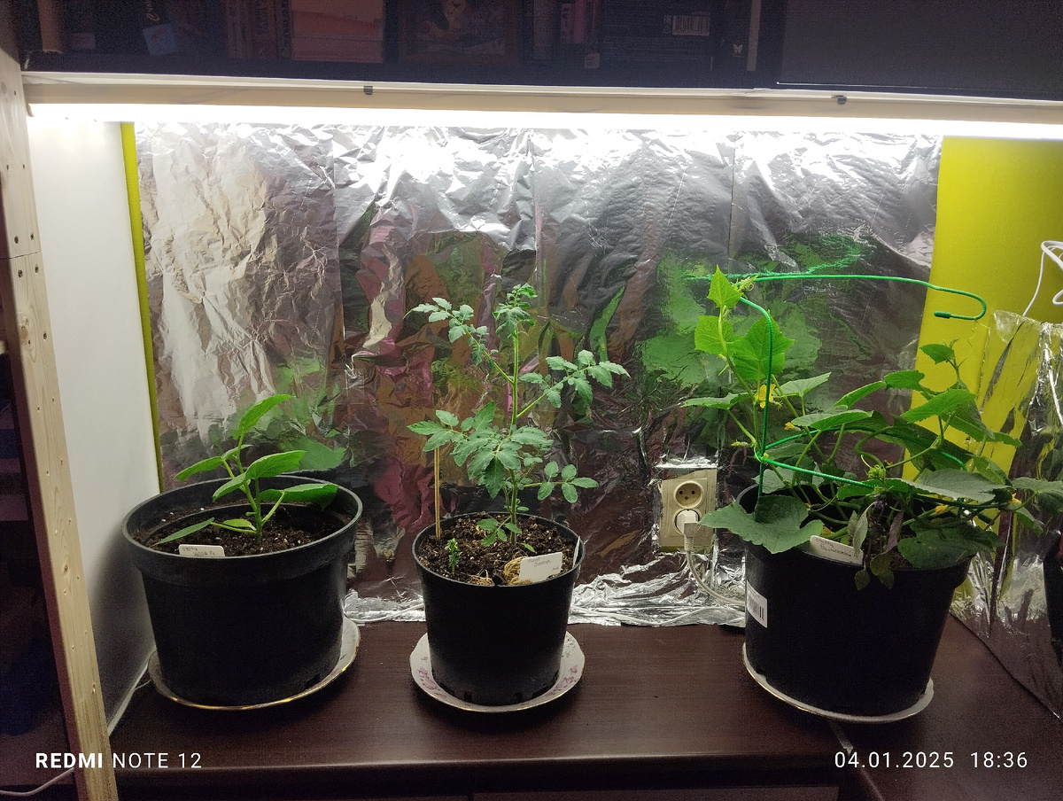 Как мы организовали новое место, провели первую подкормку и сняли первый огурчик. Фотоотчет по динамике роста по двум нашим экспериментам за прошедшую неделю. Закончилась 8 неделя начала наших посадок, наши успехи и наработки: 04/01/25 пришлось организовать дополнительное место для наших посадок, повесили еще лампы, заднюю стену прикрыли фольгой (потоки света отражаются от фольги, давая дополнительный свет культурам, растущим в тени) и расставили по другому наши посадки: Теперь по экспериментами: взошел 08/12/24. За неделю набрал массу и увеличил размер листочков Взошли 17/11/2024 примерно через месяц пересадили в большие емкости и прищипнули плеть оставив 5- 6 наст настоящих листочков. Огурчики начали формировать дополнительные плети после прищипки. Усики удаляем. 01/01/25 с Подарка сняли 1 огурчик 10 см- 48 гр.. Эксперимент закрыт 20/12/24 Шопа проклюнулся 08/12/24 (через 14 дней) 30/01/24 пересадили в большой горшок, начали формироваться дополнительные плети, огурчиков пока больше