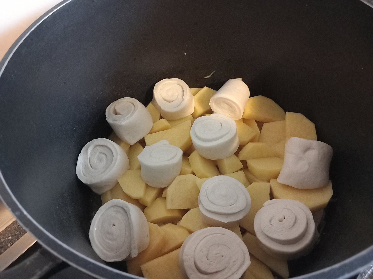 Приветствую всех, рада Вам!! Будьте здоровы , любимы, стройны и счастливы ! Не знаю как Вы, а я сейчас доедаю колбаску и начинаю режим питания под строгим контролем. Это единственный вариант держать своё тело в допустимом для здорового образа жизни. Вчера на ужин для семьи готовила штрули . Потушила мясо с капустой. Следующий слой картошка дольками. Дрожжевое тесто раскатываем в тонкий пласт, смазываем растительным маслом, чтоб слои не слиплись. Скатываем в рулет. И режим на кусочки. В моём детстве говорили, что это немецкое блюдо. Сейчас спрашиваю у местных жителей, никто о таком не слышал. Может это немецкое блюдо другого региона🤷♀️. Солим, перчим, наливаем воды, чтоб не совсем скрывало картошку иначе тесто промокнет и не поднимется. Выжерживайте расстояние, дрожжевое тесто увеличивается в размерах. Накрываем крышкой и варим 40 минут не открывая. Морковь по-корейски, я так понимаю, что тоже готовлю не как все 😁. Я туда мяско добавляю. Или рыбу. Сегодня была с индейкой ( г