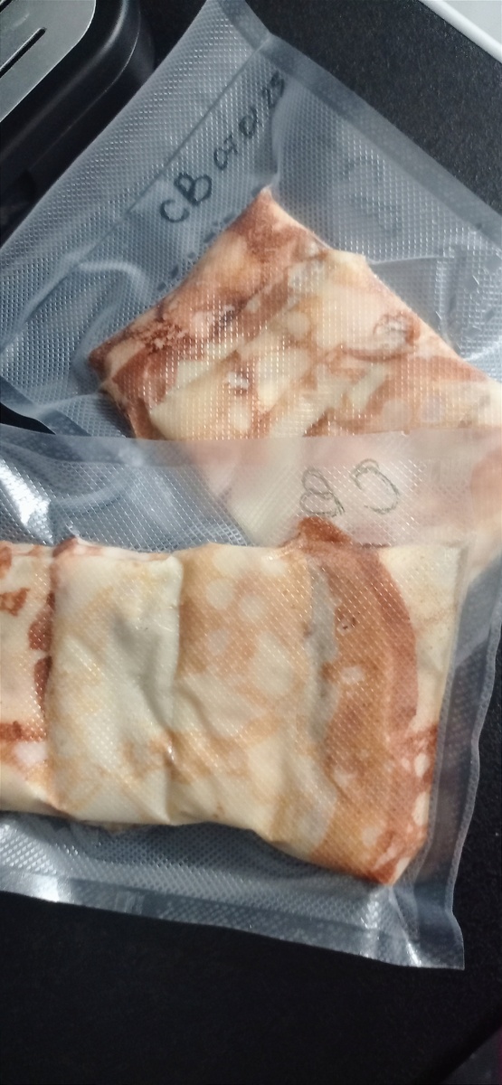 Я видео обзоре показывала покупки, так вот в итоге напекла огромную стопку блинов.. Так поели, ещё осталось прилично. И сделала начинки - ветчина+ сыр и яйцо + зелёный лук. Нафаршировала блины, завакуумировала, подписала и в морозилку. На фото только часть ⬇️