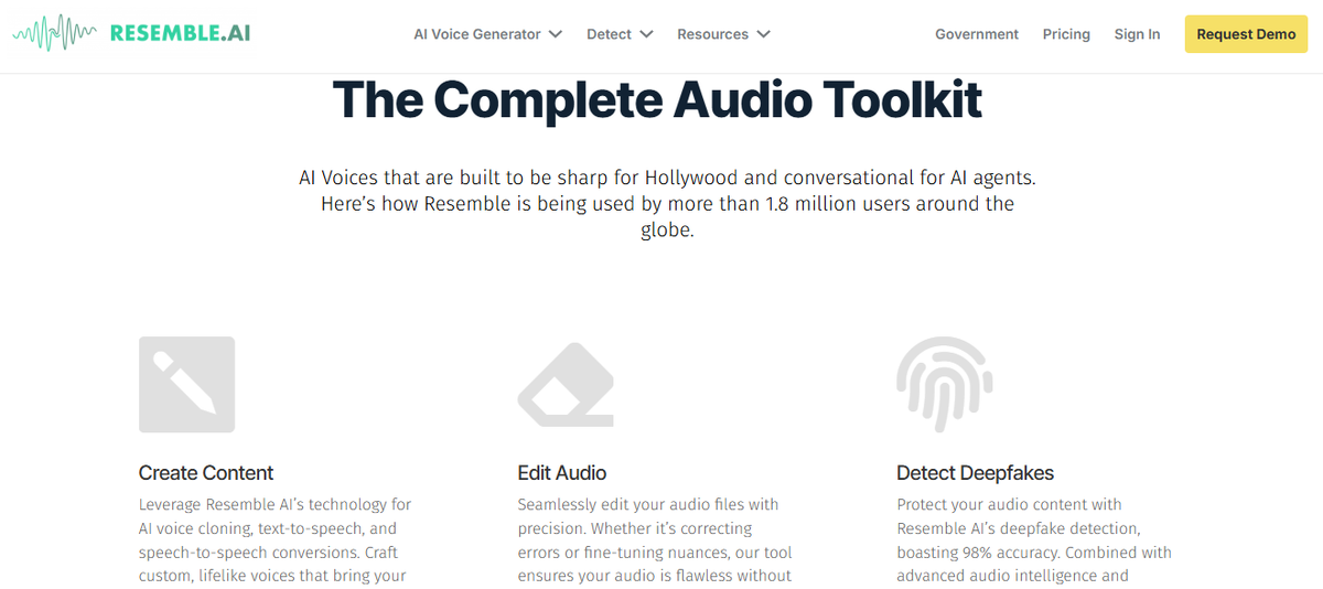 Главной особенностью платформы, как указывают разработчики, является ее способность создавать сверхреалистичные голосовые клоны, которые практически неотличимы от оригинального источника. Для анализа и воспроизведения уникальных характеристик голоса (в том числе тембра, интонации и манеры речи) система использует искусственный интеллект. Применение передовых технологий делает Resemble AI идеальным решением для создания высококачественного контента в различных сферах: к примеру, в озвучивании видеороликов и аудиокниг, разработке видеоигр, подкастов и прочих продуктов.