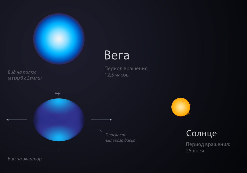 Вега — горячая звезда спектрального класса A0V, поэтому цвет звезды более раскалённый — белый, с голубоватым оттенком. Она больше и гораздо ярче Солнца: ее масса в 2,1 раза превосходит массу нашей звезды, диаметр — в 2,8 раза, Вега излучает в 40 раз больше света, чем наше дневное светило.