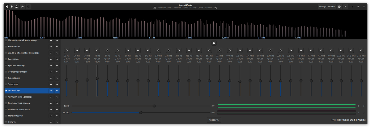 Ставим или через менеджер пакетов... ... или терминалом sudo apt install pulseeffects ( или easyeffects - для GTK4+ ) . После установки 30-ти полосный эквалайзер и аудио эффект-процессор( и не только они) будут в Меню - Аудио и видео - PulseEffects ( Easy Effects - ОС с библиотеками GTK4+ ) .