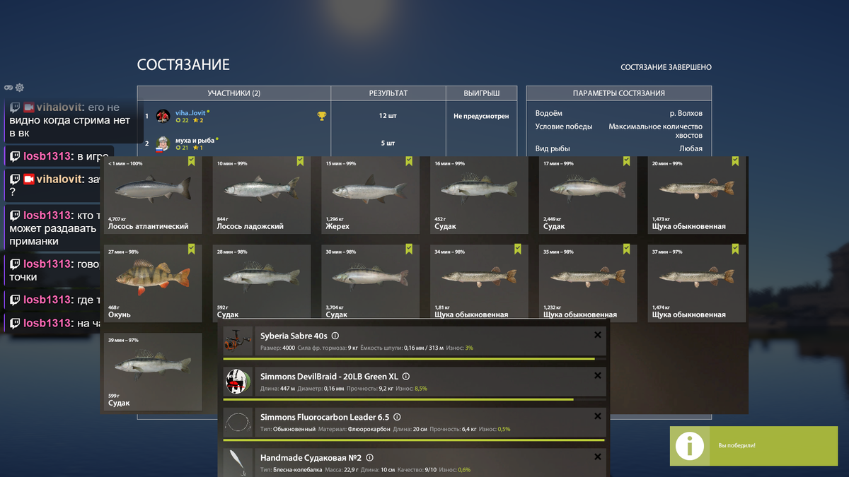 Судаковая №2 – реально очень сильная блесна и не только потому, что я взял тайменя на 10 кг на низком уровне (мой ник в игре РР4 - viha..lovit ). Данная блесна приносит рыбу на каждом забросе, данное я проверил на р. Волхов (Таймень был на р. Белая) . Алексей (ник в игре РР4 - orbitFih ) спасибо за подарок такой классной блесны, а самое главное, что объяснил как ей пользоваться. Проводка – кидаем в яму на картах, на которых есть судак. На скорости 50, 2 секунды мотаем и 3 ждем. На ямке, которая справа на р. Волхов из 10 забросов в хороший день 9 рыб, можно смело взять. Сегодня был стрим, постоянный участник стримов (ЛОСП), предложил турнир на р. Волхов. В целом я знал, что и как буду ловить (судаковая на яме справа). В итоге – честная победа с огромным отрывом. Изначально пошли щуки, было понимание, что отгрызет. Турнир выиграл. Решил сделать ещё один заброс и лось на 4,7 кг. Оставалось 5 минут премиум времени, и я решил сделать ещё один заброс. Минус блесна. Дикая щука её откусила.