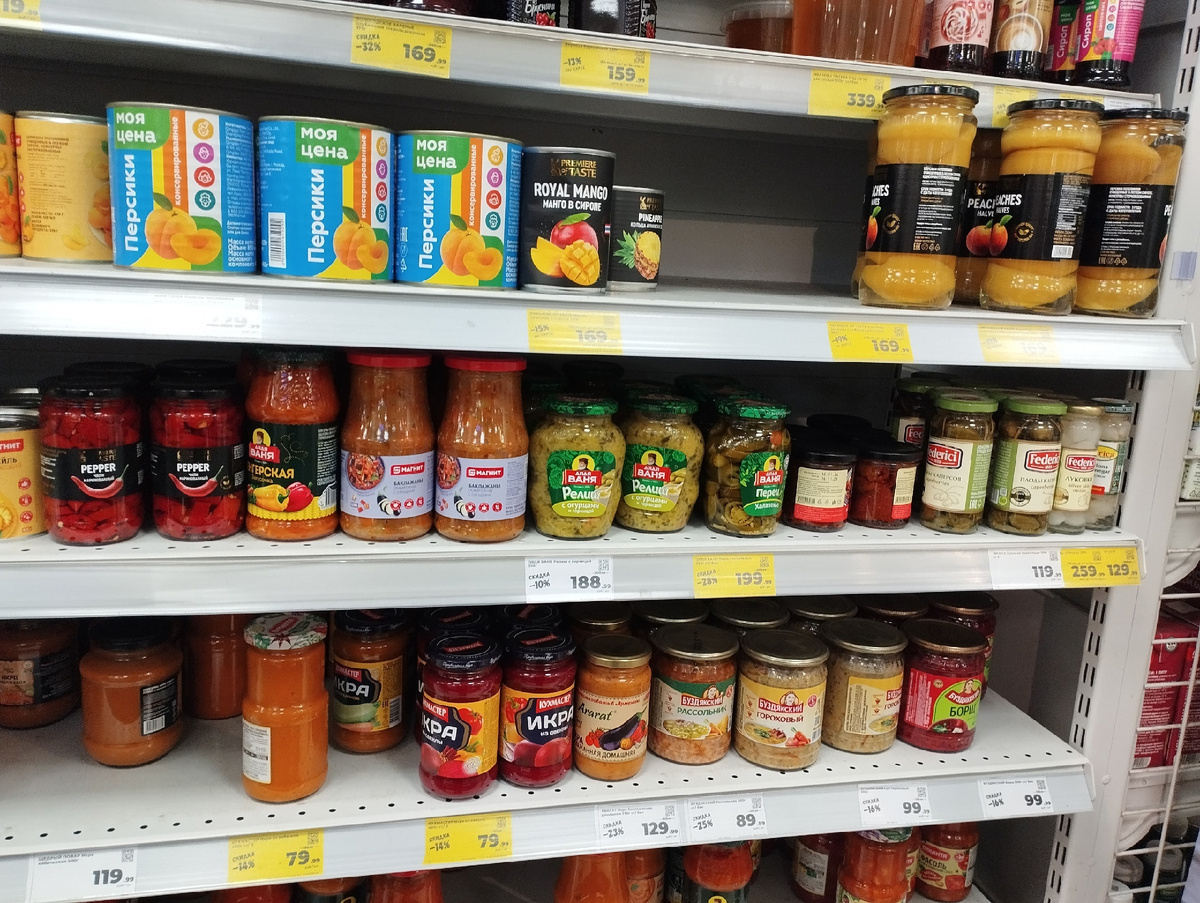 Не знаю почему, но очень уж захотелось сладкой консервации, все эти экзотические фрукты ассоциируются как раз с праздничными застольями, а за 169 рублей мы можем купить ананасы, манго, персики в сиропе, выбор отличный. От бренда "Дядя Ваня" купили релиш за 188 рублей для домашних хот-догов, а рядом с ним были перцы халапеньо за 199 рублей, но это уже для тех, кому нравится острое. На нижней полке за 79 рублей икра из кабачков или свеклы, а за 129 - баклажанная.