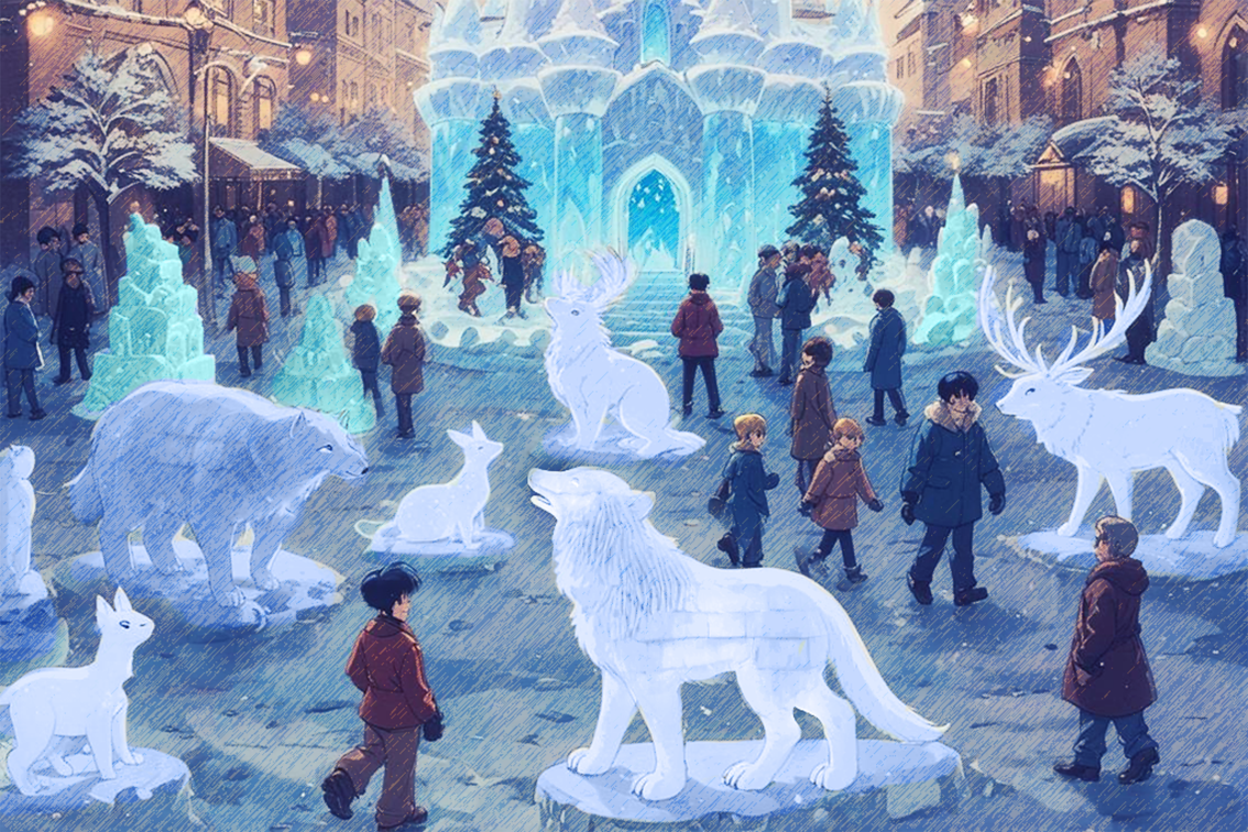 Перед наступлением Нового года центральная площадь города преобразилась в настоящую зимнюю сказку, привлекая толпы горожан, стремящихся насладиться великолепием ледяных скульптур. Мастера создали настоящие произведения искусства, вырезая изо льда фантастические фигуры: медведей, оленей, мифических птиц. В центре композиции, величественно возвышаясь, стоял замок, будто вылепленный из самой зимы. Его башни, украшенные сложными резными узорами, переливались и сверкали в свете разноцветных гирлянд, создавая атмосферу настоящего праздника. Горожане, восхищённые этим чудом, внимательно рассматривали каждую деталь, в то время как дети, не сдерживая восторга, бегали между скульптурами, оставляя лёгкие следы на снегу.