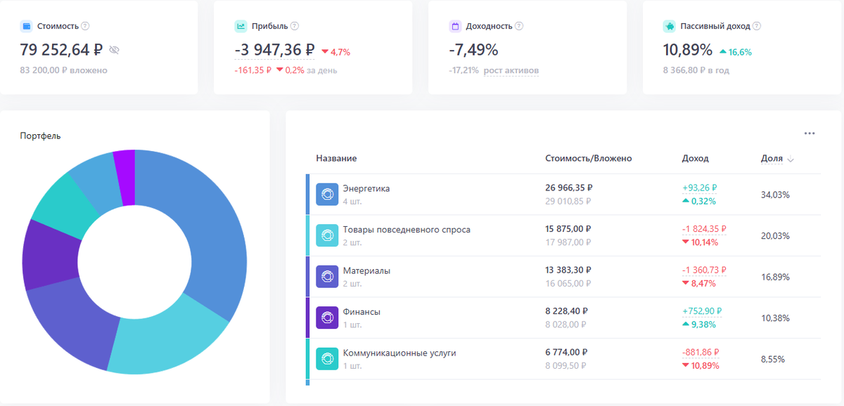 Вот и наступил Новый Год. А рынок захотел немного упасть. Ну и ладно, переживу. Никаких дивидендов не пришло, значит из пополнений только 1250 рублей из заначки. Вроде все идет по плану. Продолжаю закупаться акциями на будущее. Каких-то хороших новостей вроде нет. А из плохих, или относительно плохих, есть кое-что. Акционеры Магнита не собрались и не утвердили дивиденды, хотя уже завтра, 8 января последний день покупки под отсечку. Надеюсь успеют и что-то решат. Не был я в такой ситуации еще и что будет не знаю. Подождем пару дней и все узнаем. Как и планировал купил в портфель акции ММК. Ближайшие дивиденды прогнозируют у них маленькие. Но мне главное, чтобы в будущем хорошо платили. Поэтому докупаю. Купил 3 лота ( 30 акций ) по цене 38,14р. Всего у меня в портфеле стало уже 180 акций со средней ценой покупки 47,38р. Расти до плюса еще долго. Мой портфель на данный момент выглядит так: Уже 2 сектора в плюсе. Пора бы уже выходить доходности в плюс. Прогноз по дивидендам выглядит