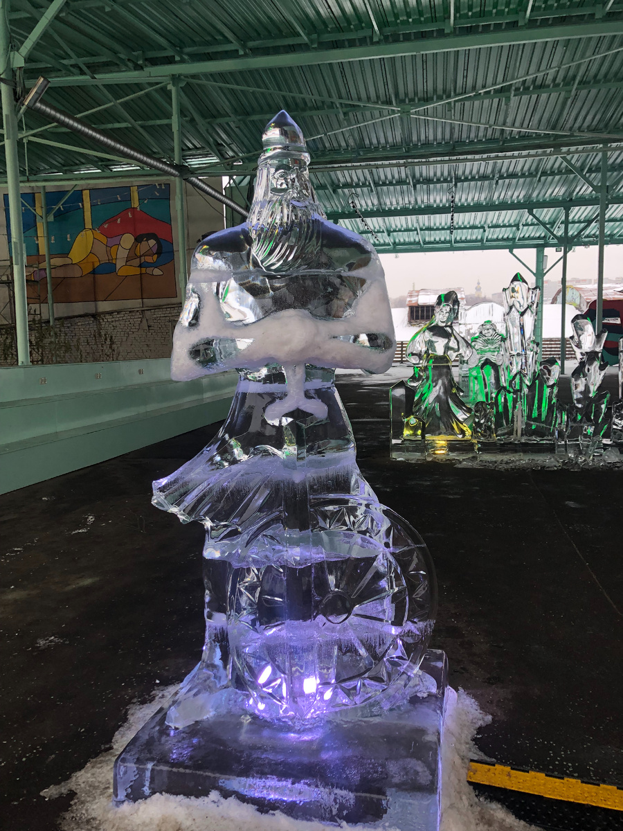 Сказочные залы с инсталляциями в стиле современных постановок по русским народным сказкам (читай - "Последний Богатырь" и Ко) - подробно и с фото. Прошли мы на Винзавод необычным для нас путём, выйдя из Курской через пятый выход, поэтому первое, что мы увидели, подходя к центру - выставка ледяных фигур (листайте галереи). Здесь были наши любимые герои русских сказок: Василиса Премудрая, Баба Яга, Кощей, Лиса с Колобком, Богатырь и другие, Казалось, сказочные персонажи ожили под руками мастеров. Само Выставочное пространство находится в подвалах винохранилища. Глубоко под землёй, лифта и туалета я там не видела, это всё надо учитывать , отправляясь на выставку с детьми и бабушками. Вообще страшновато было спускаться в глубокое подземелье с единственным выходом... Лестница вниз очень крутая, винтовая, у меня аж голова кружилась при спуске, а наверх с моими ногами я еле вскарабкалась. Зато предусмотрен гардероб. Билеты можно купить внизу, а можно на сайте. Перед входом можно осмотрет