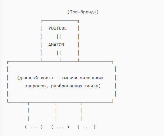 - Длинный хвост важен для более узких, но высококонверсионных поисков, однако только на него полагаться нельзя — слишком мало суммарного трафика.